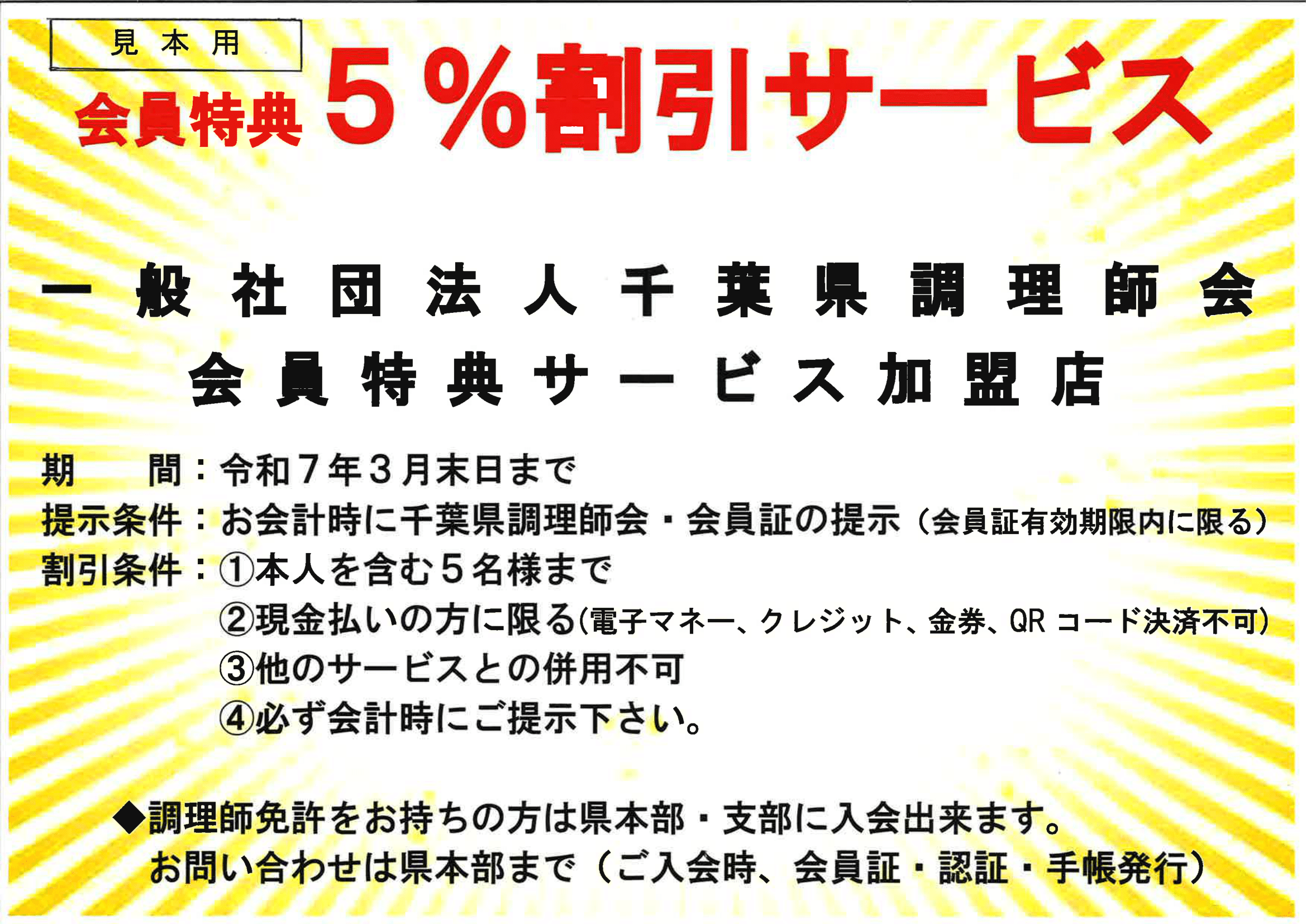 ※当会会員証提示で、現金利用の方のみ、5名様まで、5%割引いたします(令和7年3月末まで)。
